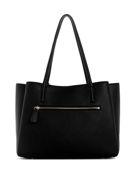 Upgrade your everyday carry with the Isola Multi Compartment Tote by GUESS. Crafted from eco pebble PU in a sleek black finish, this spacious tote is designed with multiple compartments to keep essentials organized. Finished with dual shoulder straps, shiny gold hardware, and embossed logo detailing with a lock-and-key charm, it blends practicality with timeless sophistication.