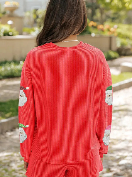 This set is a festive and eye-catching choice for the Christmas season. * Featuring sequin Santa Clauses wearing hats of different colors. * Including a drop shoulder long sleeve top and elastic pull on shorts.