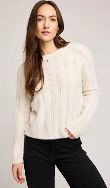 The Cornelia sweater is made of a cozy yarn with a fuzzy handfeel. Features include a raglan sleeve and a cable knit stitch pattern throughout.