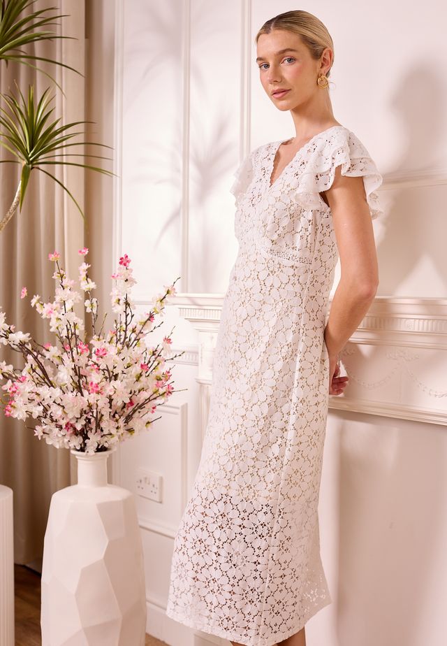 This elegant white dress features intricate lace detailing throughout, creating a sophisticated and timeless look. It has a V-neckline and short, ruffled sleeves that add a touch of femininity. The fitted waist accentuates the figure, while the midi-length skirt flows gracefully to mid-calf, offering a refined silhouette. Made from a delicate, breathable fabric, the dress is perfect for special occasions or summer events. Complete with a pair of stylish white heels, this dress exudes grace and understated elegance.