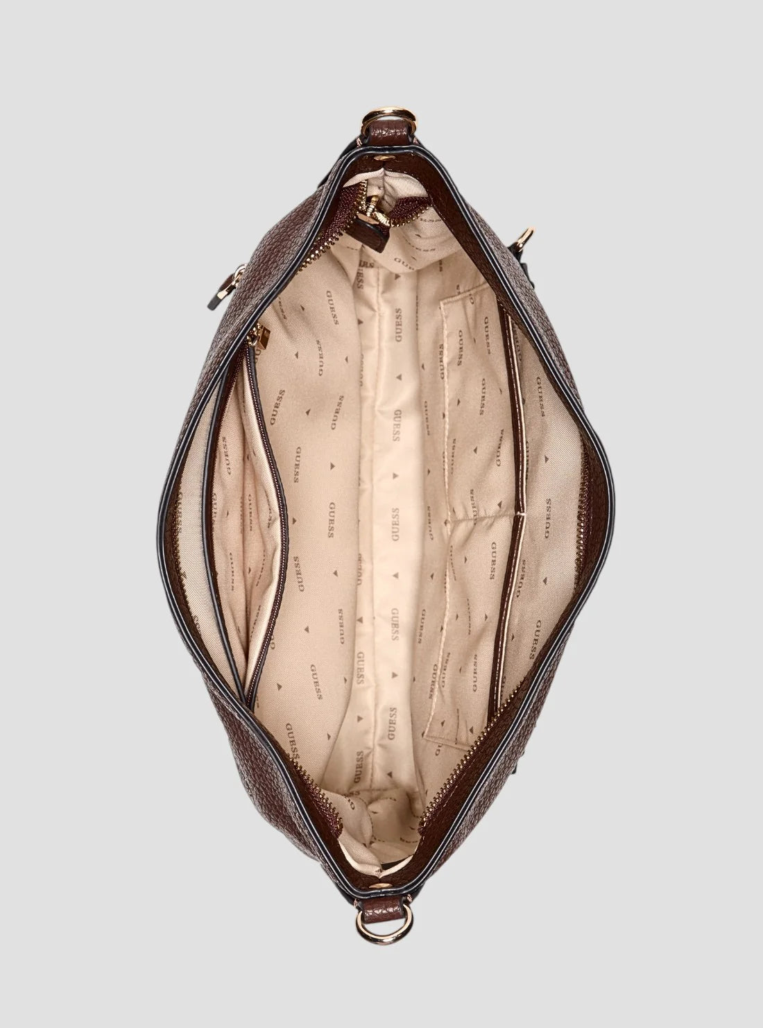 Carry your essentials in effortless style with the Brown Marsha Crossbody Bucket Bag. Crafted from eco big grain PU, this softly structured bucket bag combines everyday practicality with polished GUESS detailing. Featuring a spacious interior, a front zip pocket for easy access, and shiny gold hardware, it’s finished with a detachable charm for a refined touch.