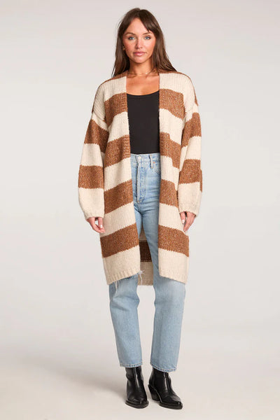 The Emersyn Sweater is a classic duster with an oversized fit, featuring cozy cream and café au lait stripes.